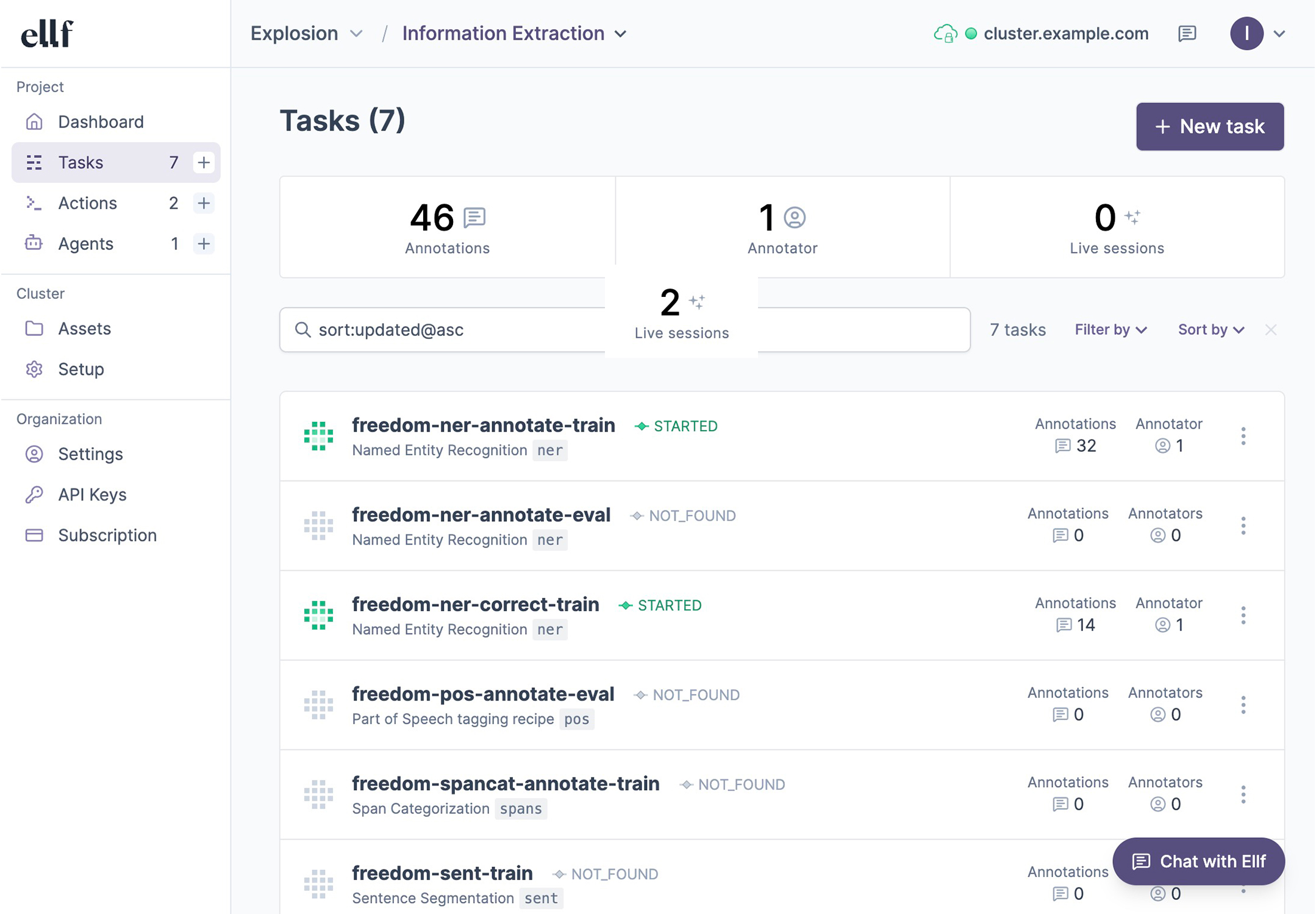 The platform lets you view your tasks, actions and agents, as well as data assets on your cluster, and collaborate on them with your team. You can interact with Ellf and manage resources via the ellf command-line interface or visually in the app.