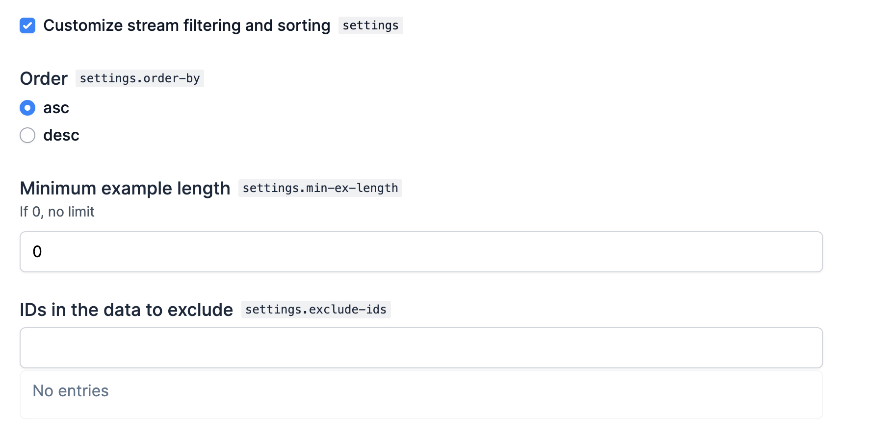 The @ellf_type decorator lets you turn a dataclass into a custom type. Like the recipe decorator, it also has a field_props argument that lets you provide props for the fields included in the dataclass. This example shows a custom type combining various settings for applying custom sorting and filtering to a stream of data: