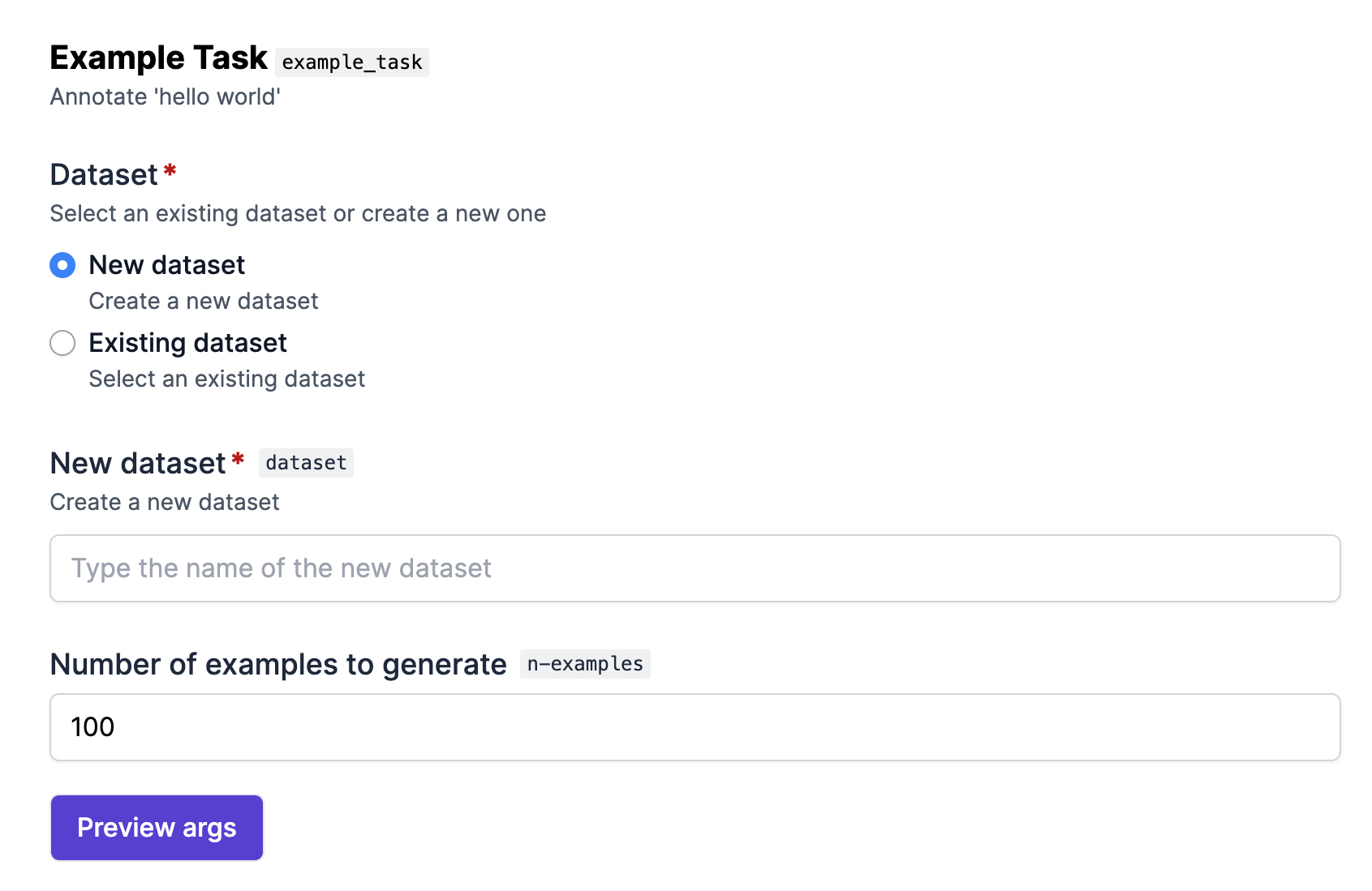As you make changes to the file example_task.py, the preview live-reloads so you can see how your changes affect the generated form fields. Note that since the preview runs outside of the Ellf context and isn’t connected to any cluster, it comes with some limitations and includes dummy data for datasets and assets and only performs superficial data validation.