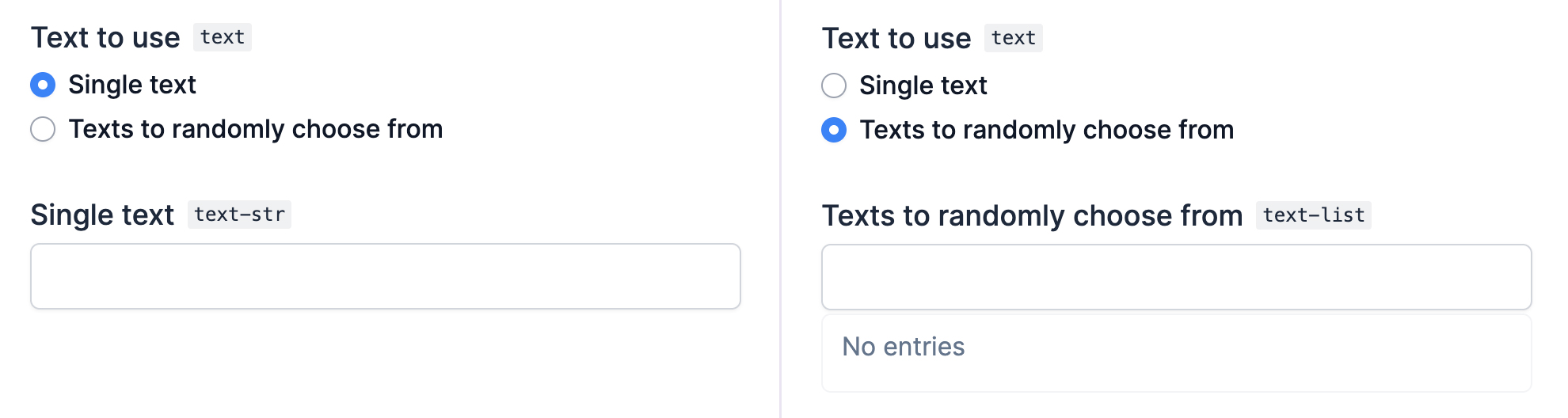 "text-list": ListProps(title="Texts to randomly choose from"),