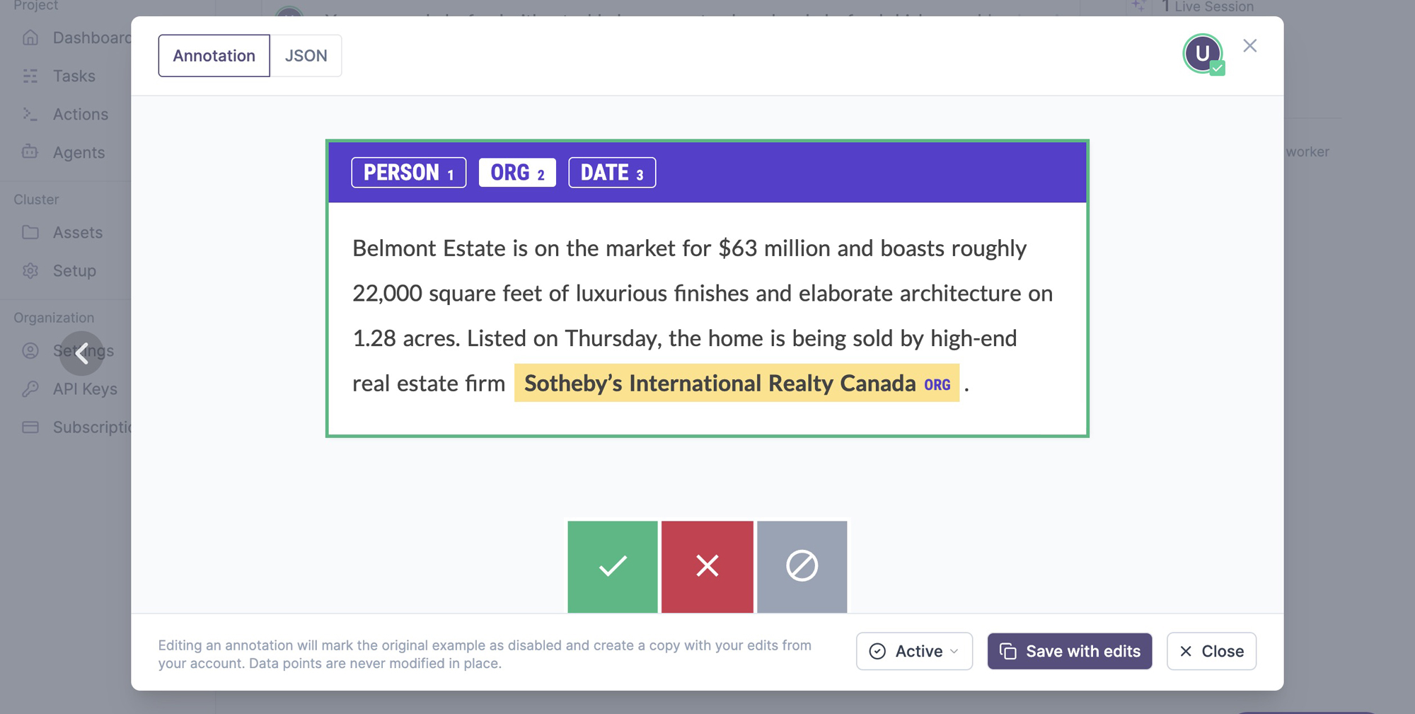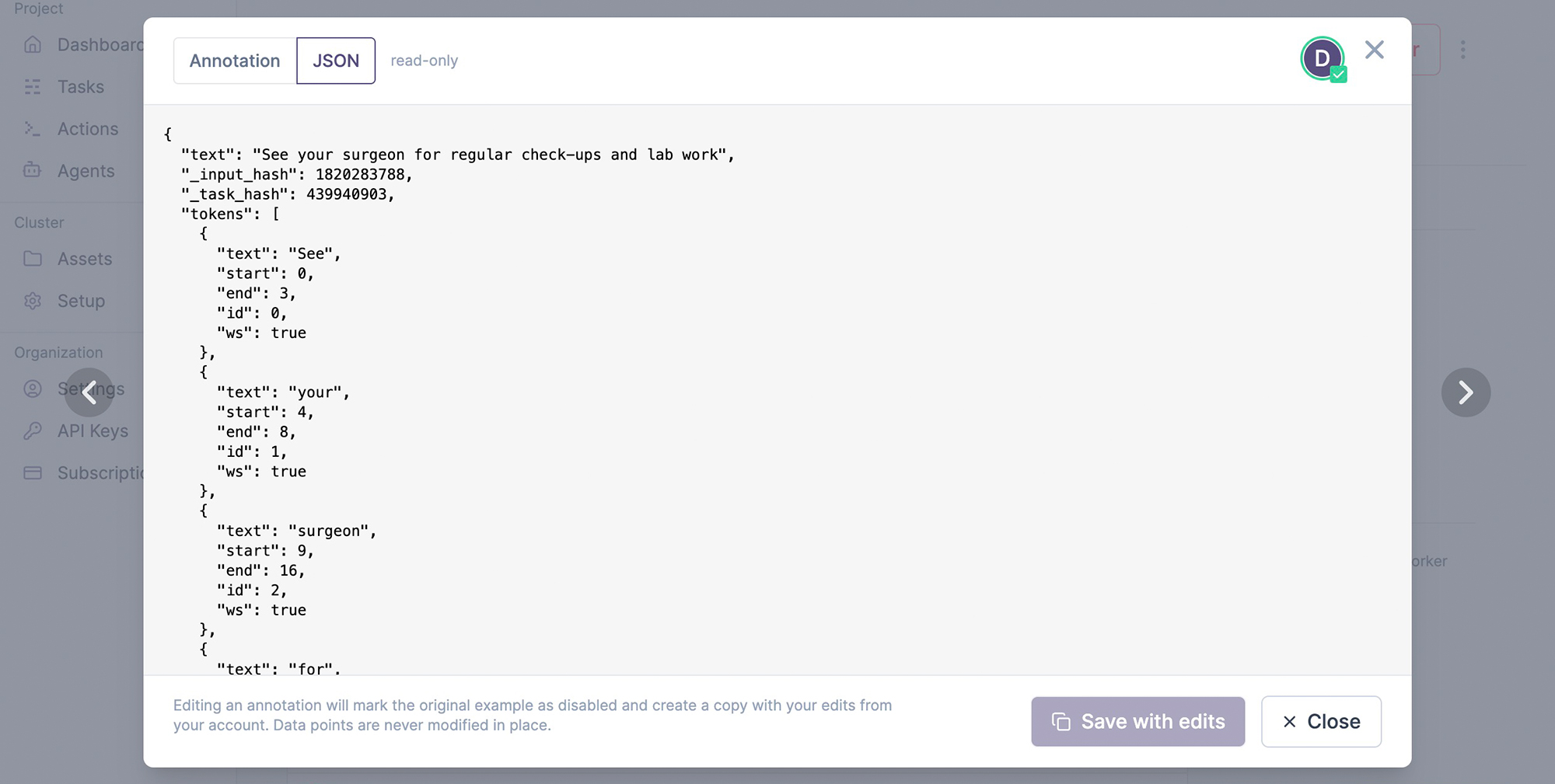 The annotations tab lists the annotated examples with an inline preview. On click, it shows the example and its underlying JSON data, which depends on the data type and interface used. Editing an example will create a copy, save it from your user account and mark the edited example as disabled, so it’s excluded from any further processes. Once an example is added to the database, it can never be changed in place. This ensures that no data points are lost and you’ll always be able to compute accurate metrics like inter-annotator agreement.